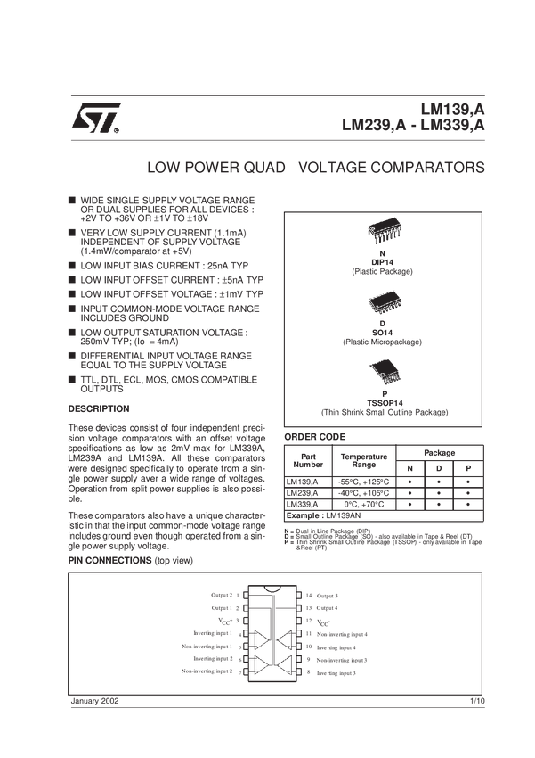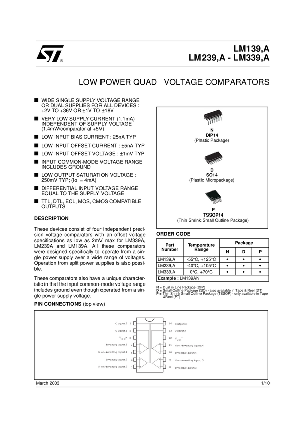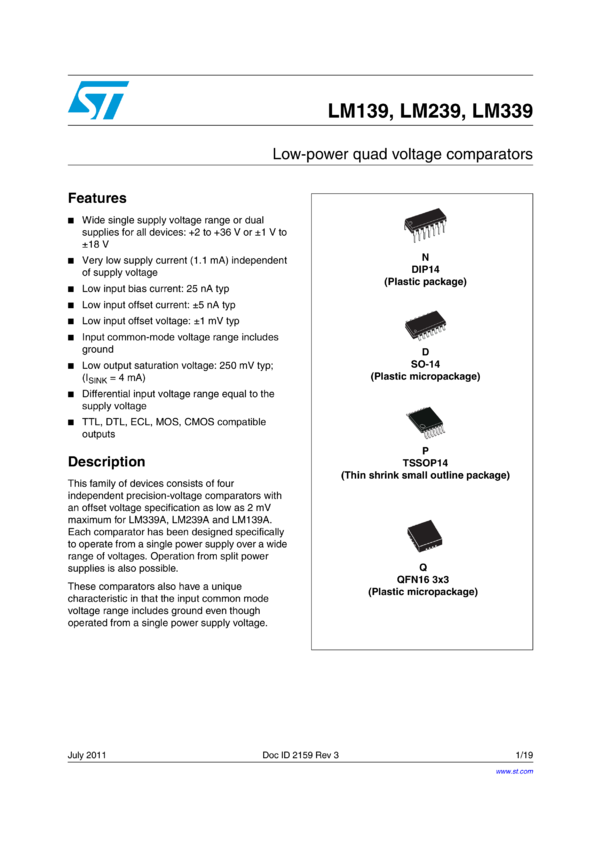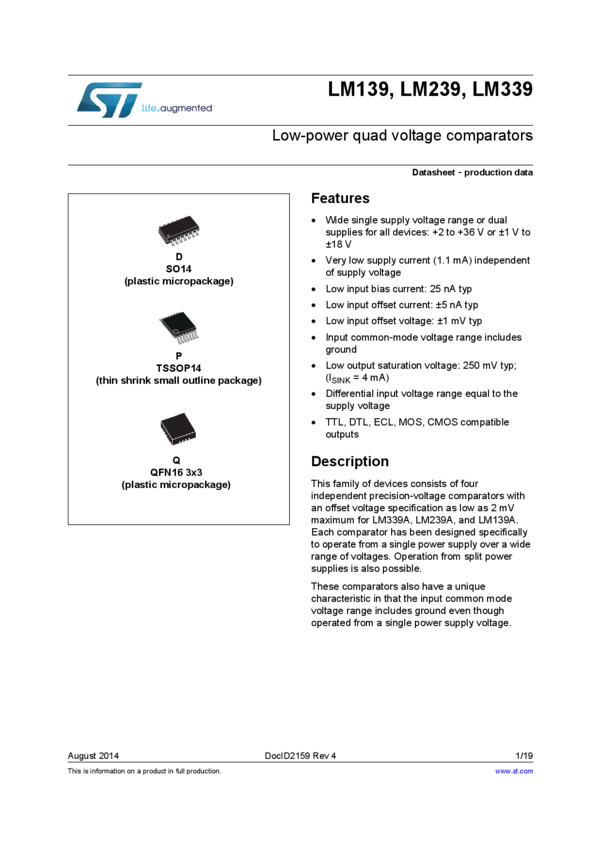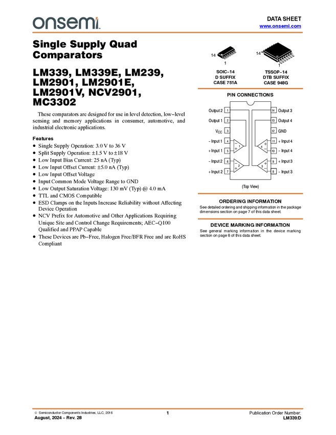 Układ scalony; LM339N/NOPB; komparator; low-power; 1,3us; 1,5-18V DC; 4 komparatory; DIP14; THT; RoHS