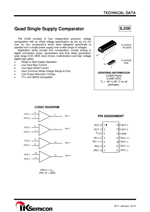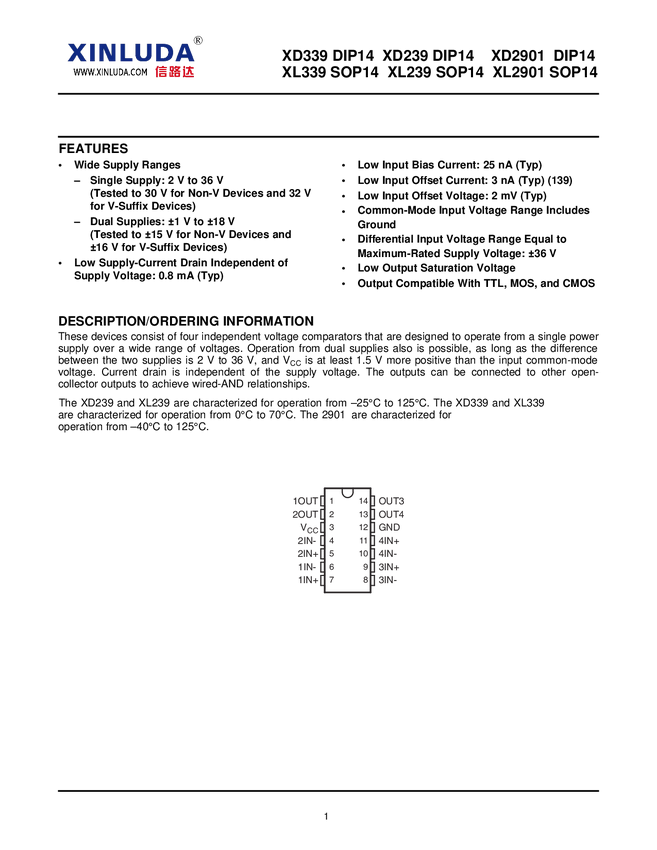 Układ scalony; XD339N; komparator; low-power; 1300ns; 2-30V DC; 4 komparatory; DIP14; THT; = LM339N; XINLUDA; RoHS