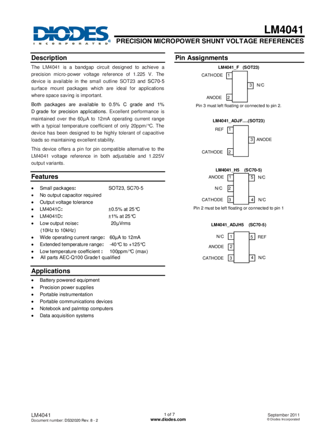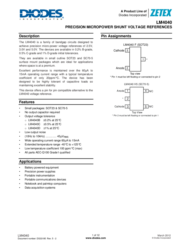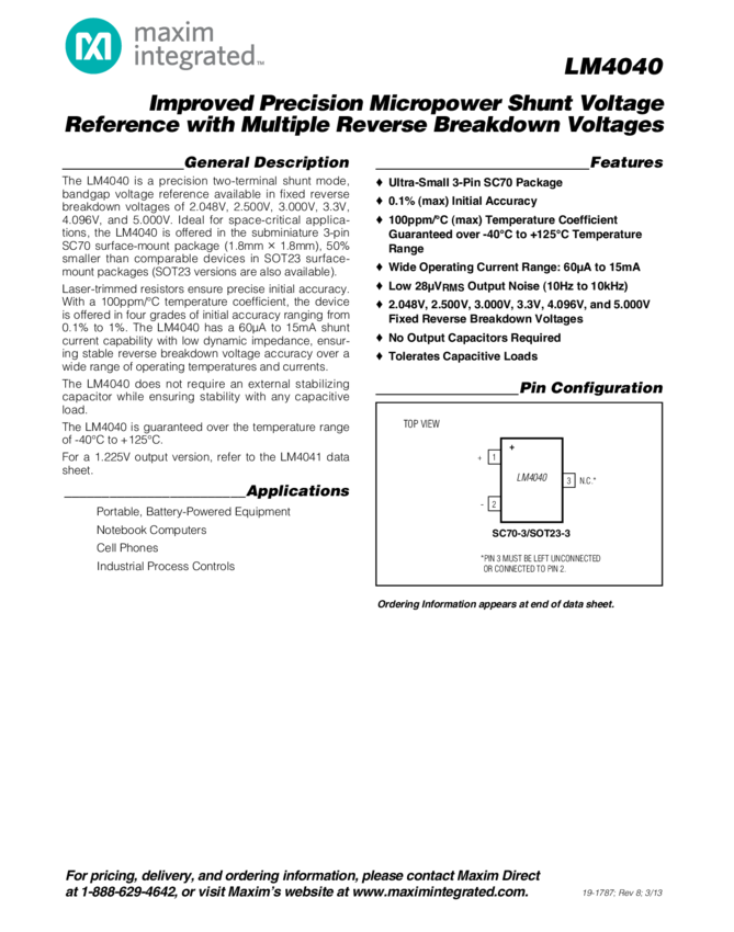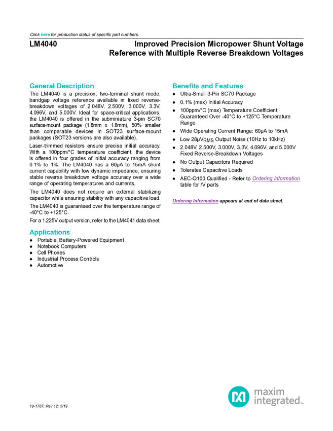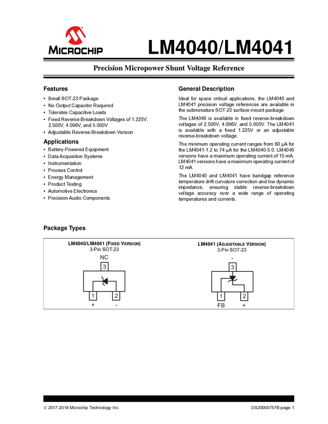 LM4040, LM4040A, LM4040B, LM4040C, LM4040D Improved Precision Micropower Shunt Voltage Reference with Multiple Reverse Breakdown Voltages