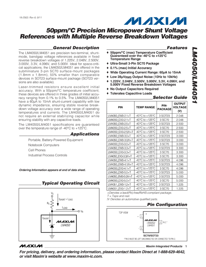 LM4050, LM4050A, LM4050B, LM4050C, LM4051, LM4051A, LM4051B, LM4051C 50ppm/°C Precision Micropower Shunt Voltage References with Multiple Reverse Breakdown Voltages