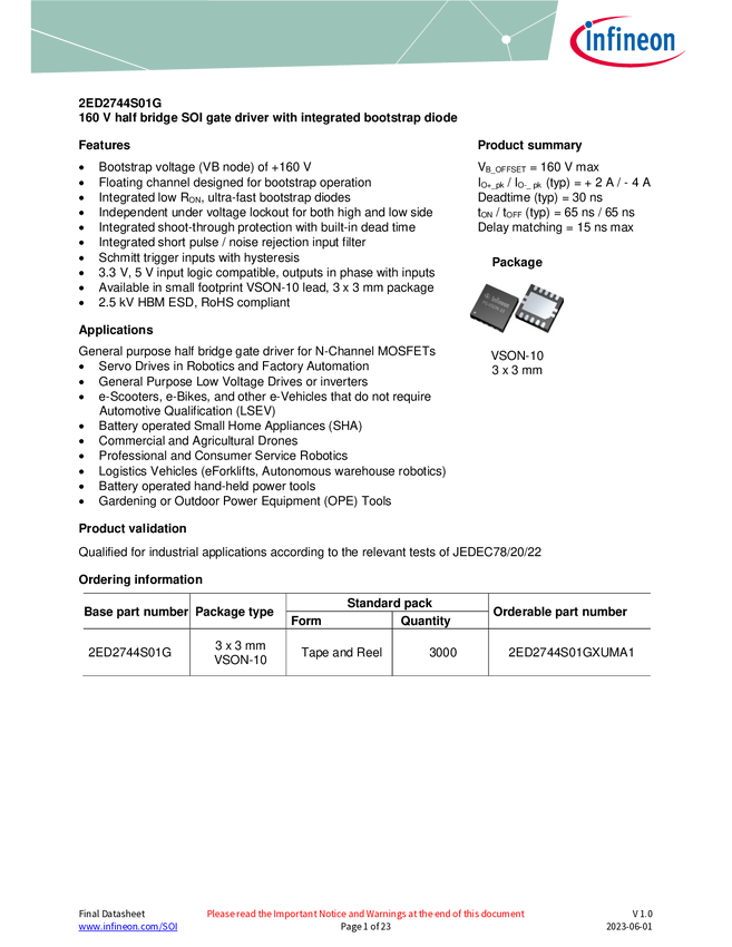160 V half bridge SOI gate driver with integrated bootstrap diode MOTIX™ 160 V half bridge with typical 2 A source and 4 A sink currents in a small footprint VSON10, 3x3 mm package for N-Channel . Integrated bootstrap diodes are used to supply the external high side bootstrap capacitor. Protection features include under voltage lockout on both Vcc and VB pins. The 2ED2744 is fully qualified for industrial applications according to the relevant tests of JEDEC78/20/22.