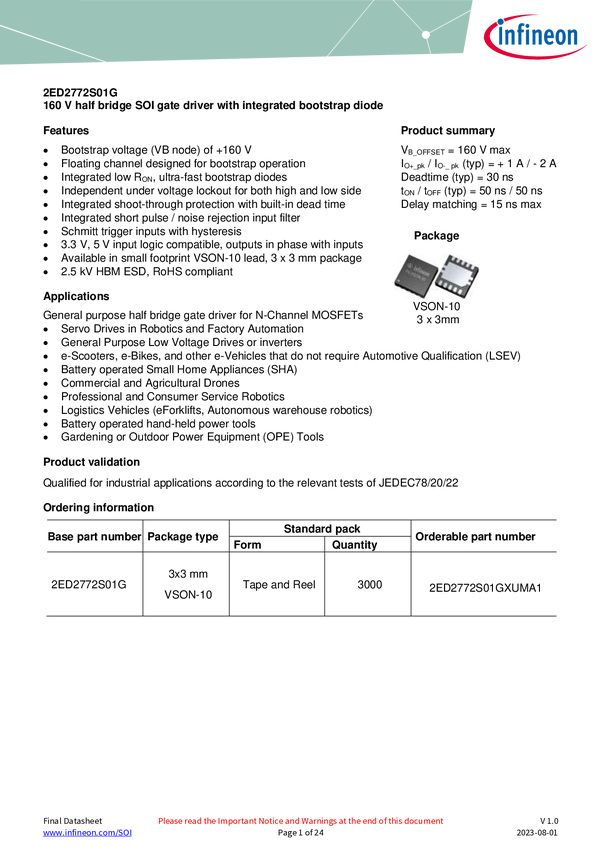 160 V half bridge SOI gate driver with integrated bootstrap diode MOTIX™ 160 V half bridge SOI based gate driver with typical 1 A source and 2 A sink currents in a small footprint VSON10, 3x3 mm package for N-Channel MOSFETS. Integrated bootstrap diodes are used to supply the external high side bootstrap capacitor. Protection features include under voltage lockout on both Vcc and VB pins. The 2ED2772 is fully qualified for industrial applications according to the relevant tests of JEDEC78/20/22.