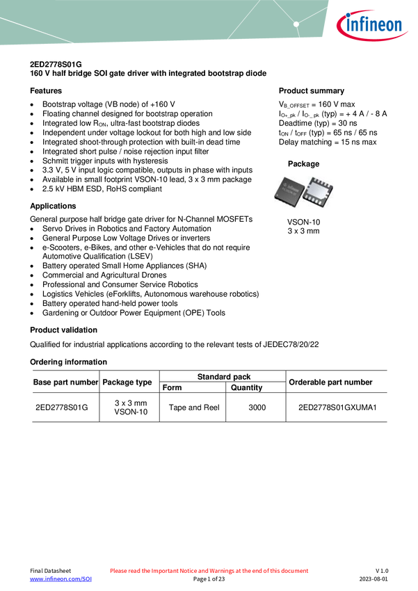 160 V half bridge SOI gate driver with integrated bootstrap diode MOTIX™ 160 V half bridge SOI based gate driver with typical 8 A source and 4 A sink currents in a small footprint VSON10, 3x3 mm package for N-Channel MOSFETS. Integrated bootstrap diodes are used to supply the external high side bootstrap capacitor. Protection features include under voltage lockout on both Vcc and VB pins. The 2ED2778 is fully qualified for industrial applications according to the relevant tests of JEDEC78/20/22.