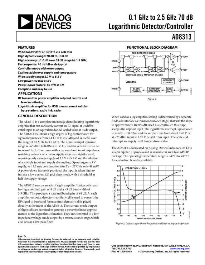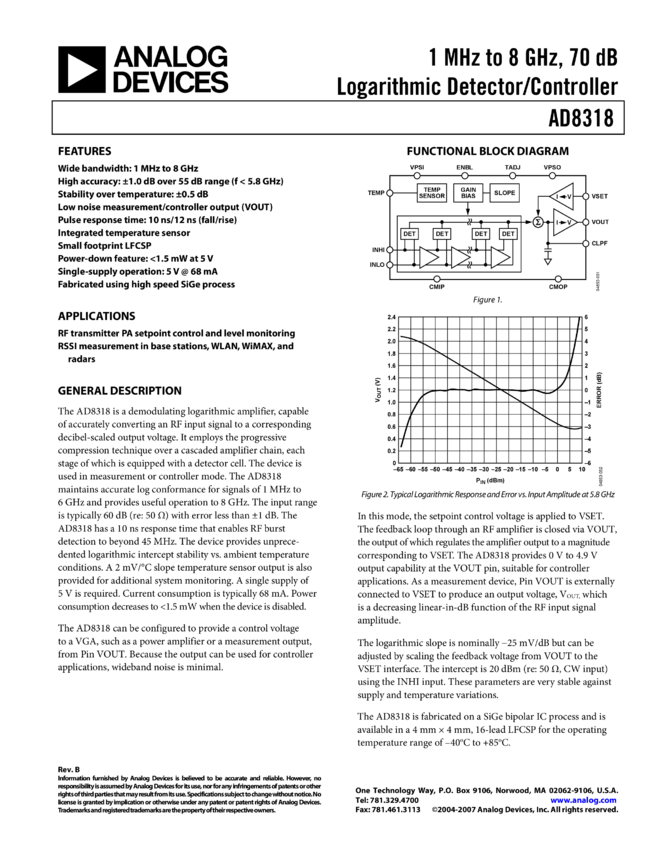 AD8318: 1 MH TO 8 GH, 70 B Logarithmic Detector / Controller