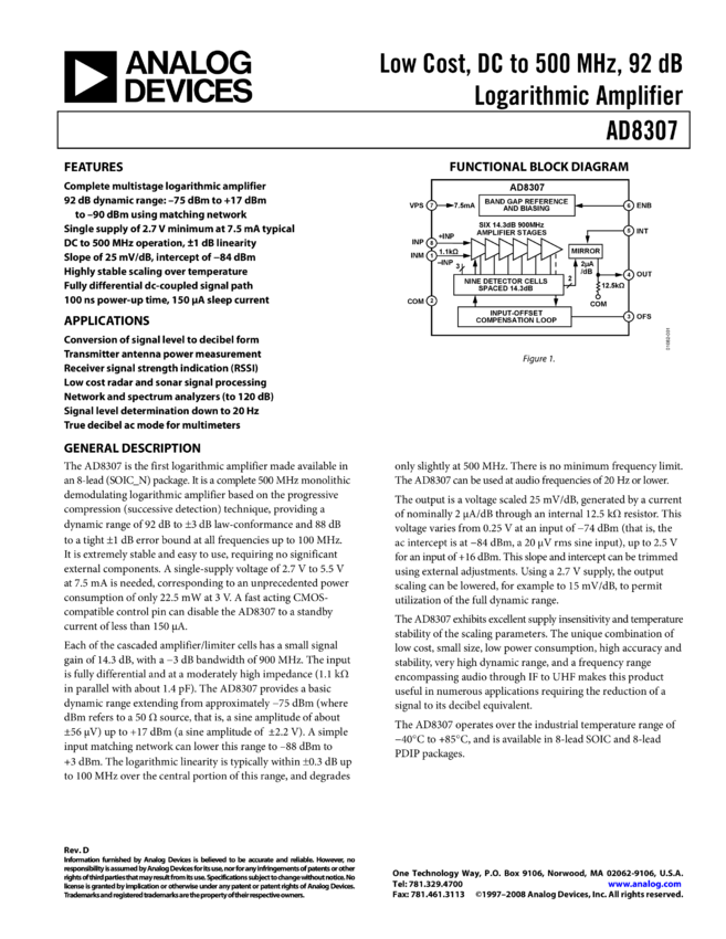 AD8307: Low Cost, DC to 500 Logarithmic Amplifier