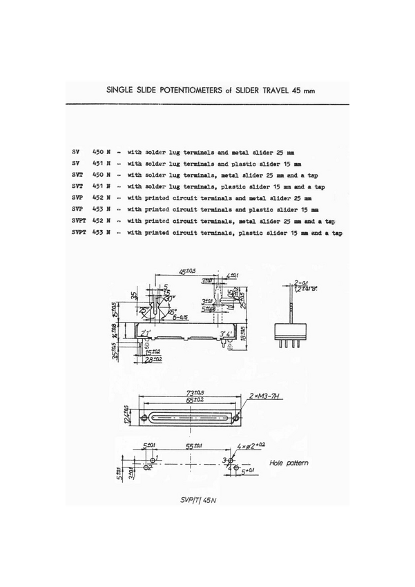 Potencjometr suwakowy travel 45mm; wym: dł.73x szer. 12,4 wys. 14,4 mm, z pinami 17mm; rozstaw śrub 65mm 2xM3; piny do druku rozstaw: wew.55mm, zew 65mm; wodzik metal 25mm uwaga: elementy ze starej produkcji B-logarytmiczny;