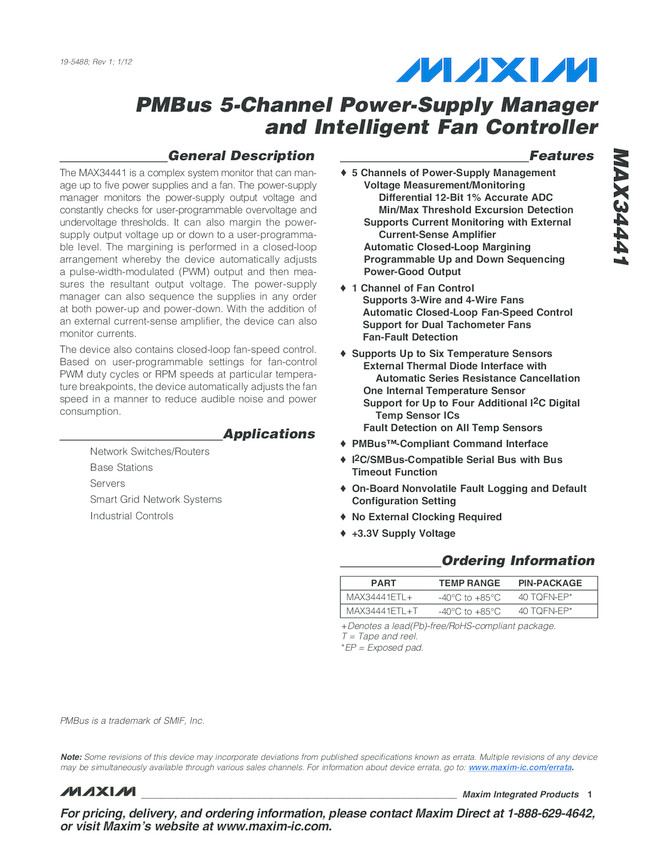 MAX34441 PMBus 5-Channel Power-Supply Manager and Intelligent Fan Controller and Fault Logging