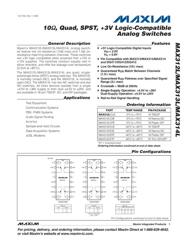 MAX312L, MAX313L, MAX314L 10Ω, Quad, SPST, +3V Logic-Compatible Analog Switches