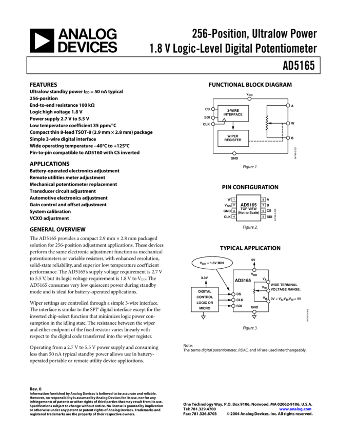 AD5165: 256-Position, Ultralow Power 1.8 V Logic-Level Digital Potentiometer