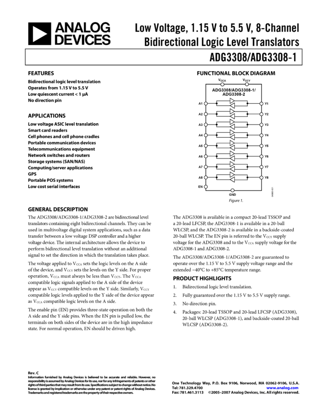 ADG3308: Low Voltage, 1.15 V to 5.5 V, 8-Channel Bidirectional Logic Level Translator