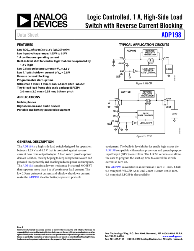 ADP198: Logic-Controlled, 1 A, High-Side Load Switch with Reverse Current Blocking