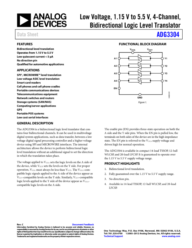 ADG3304: Low Voltage 1.15 V to 5.5 V, 4 Channel, Bidirectional, Logic Level Translator