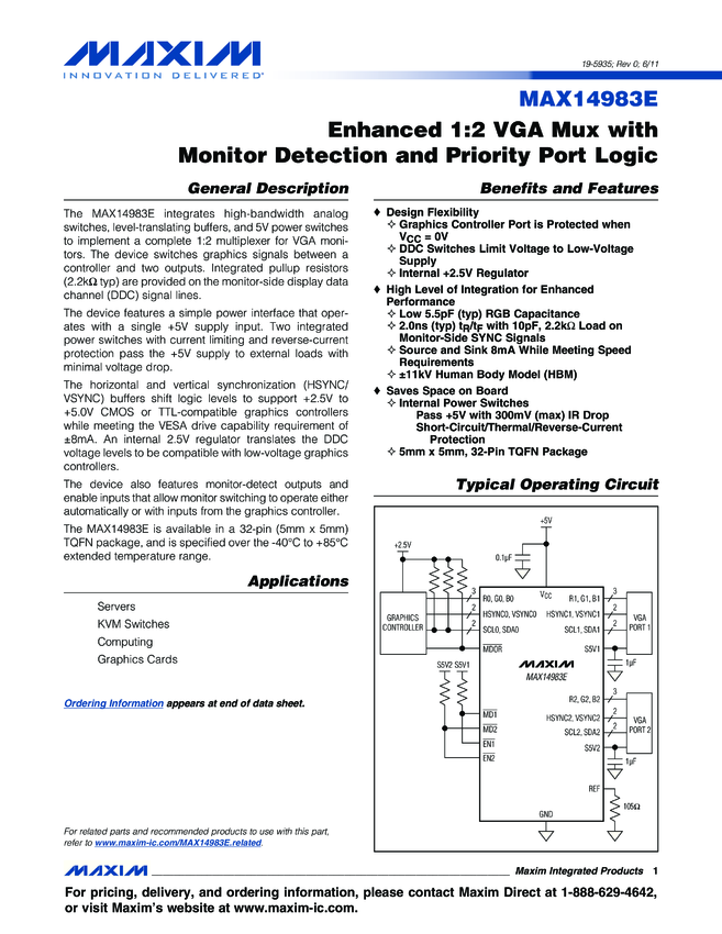 MAX14983E Enhanced 1:2 VGA Mux with Monitor Detection and Priority Port Logic