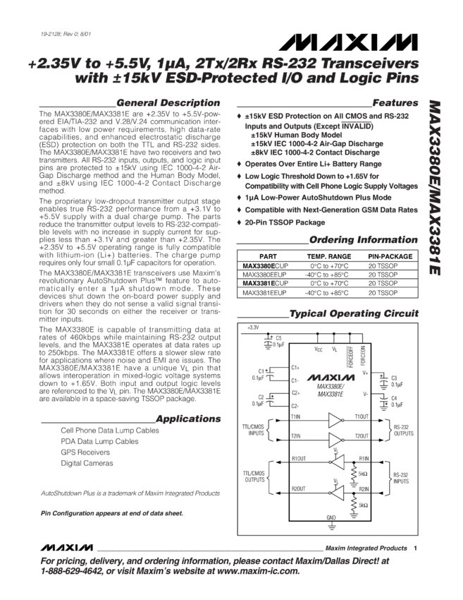 MAX3380E, MAX3381E +2.35V to +5.5V, 1µA, 2Tx/2Rx RS-232 Transceivers with ±15kV ESD-Protected I/O and Logic Pins