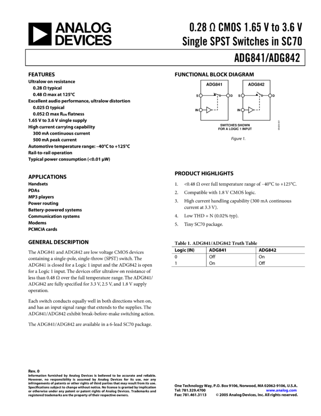 ADG842: 0.28 Ω CMOS 1.65 V to 3.6 V Single SPST Switches in SC70 Open for a Logic 1 Input