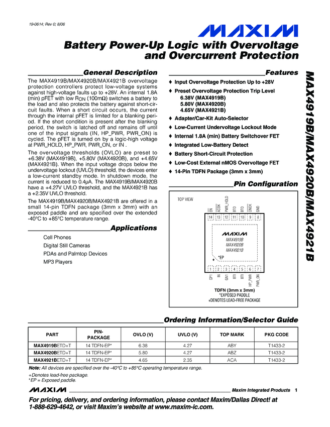MAX4919B, MAX4920B, MAX4921B Battery Power-Up Logic with Overvoltage and Overcurrent Protection