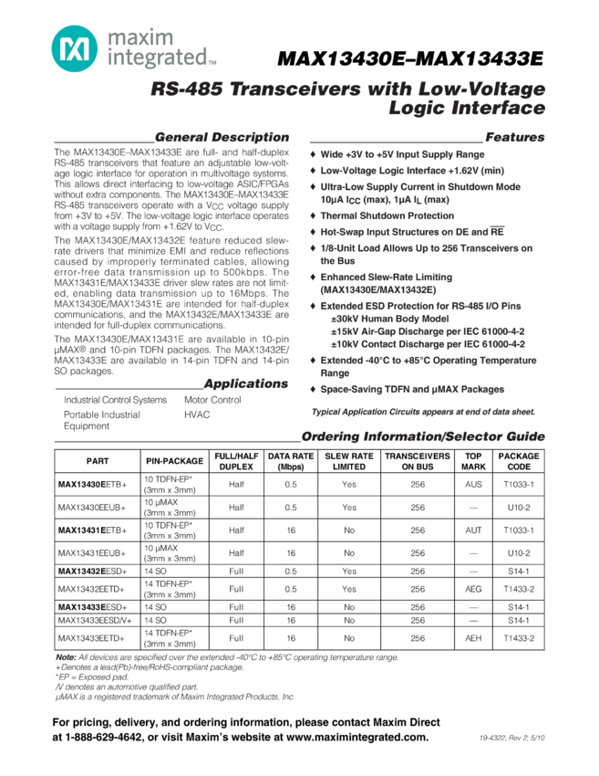 MAX13430E, MAX13431E, MAX13432E, MAX13433E RS-485 Transceivers with Low-Voltage Logic Interface