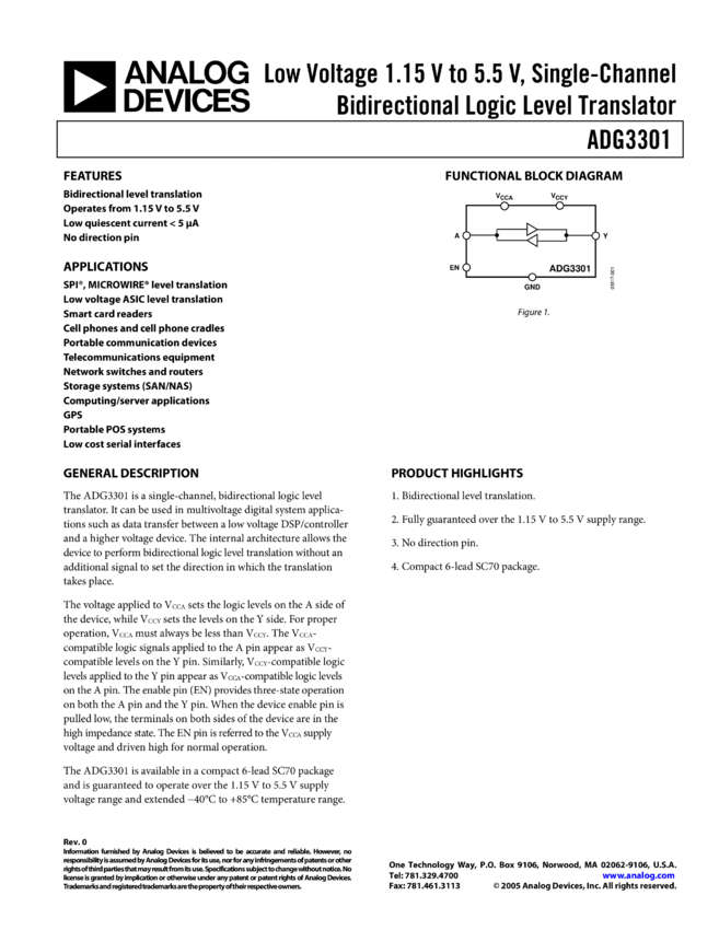 ADG3301: Low Voltage 1.15 V to 5.5 V, Single-Channel Bidirectional Logic Level Translator