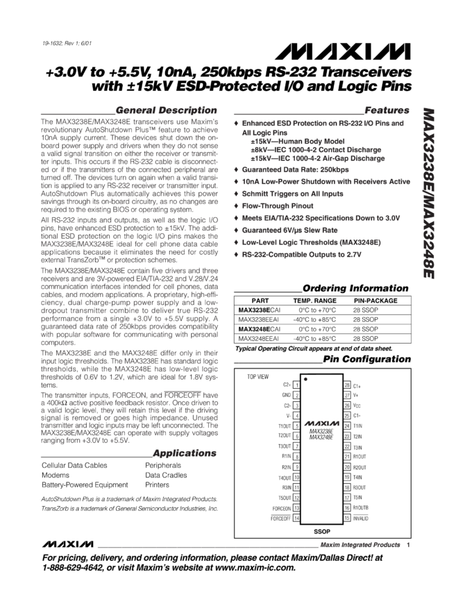 MAX3238E, MAX3248E +3.0V to +5.5V, 10nA, 250kbps RS-232 Transceivers with ±15kV ESD-Protected I/O and Logic Pins