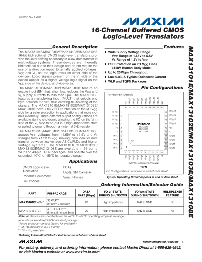 MAX13101E, MAX13102E, MAX13103E, MAX13108E 16-Channel Buffered CMOS Logic-Level Translators