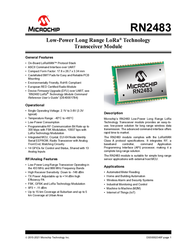 RN2483 LoRa Technology Transceiver Module Data Sheet