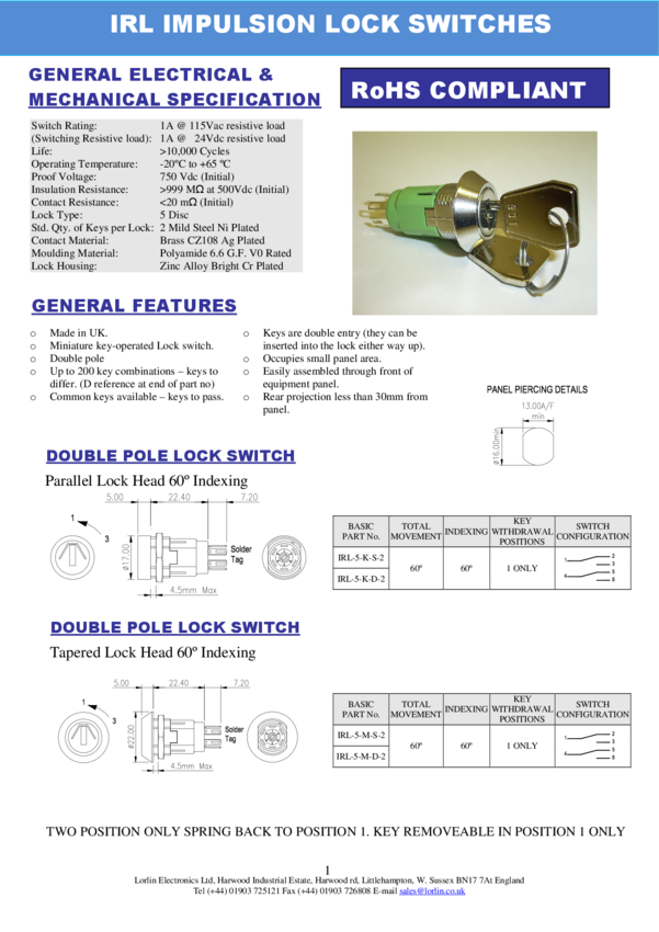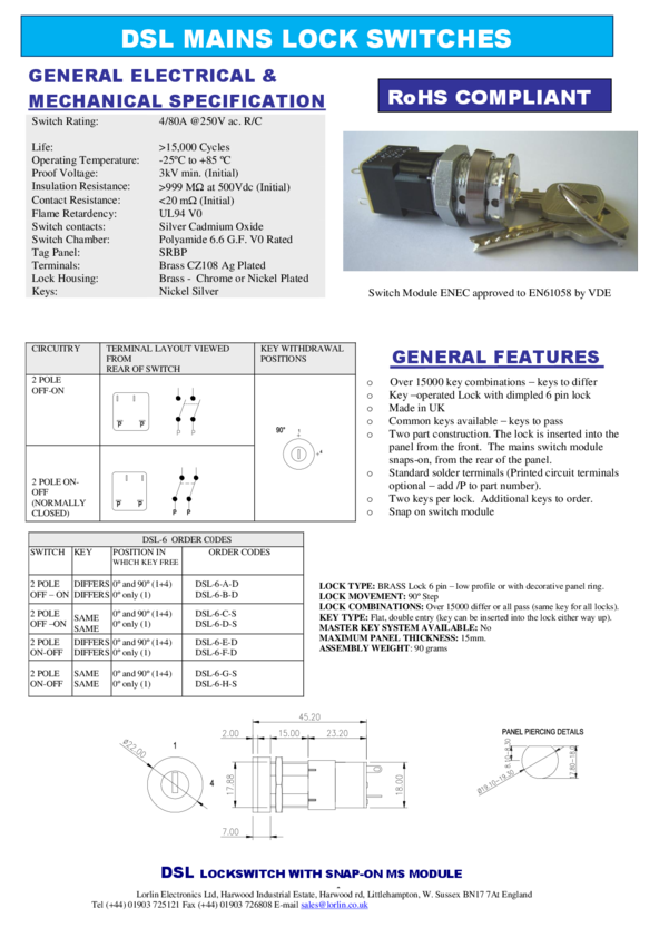 Switch Key Lock N.O./N.C. DPST 60° Flat Key 1A Solder Lug Panel Mount