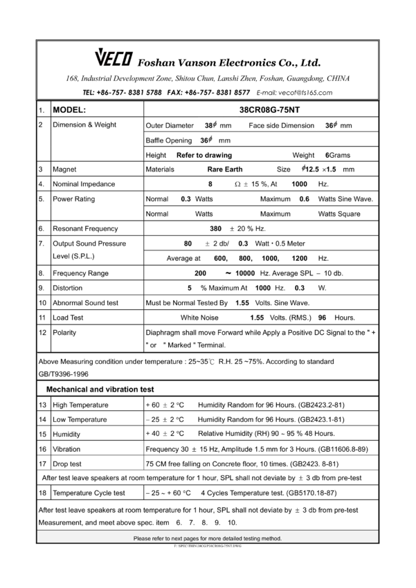Głośnik LowProfil, 8Ω, 0.3W, 200Hz-10kHz, fr=380Hz, D=38mm, h=4.2mm