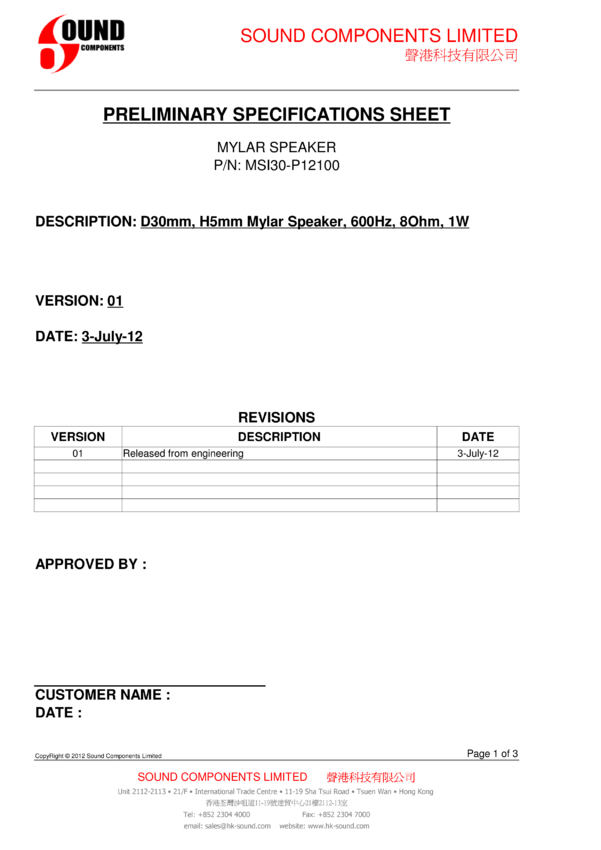 Głośnik LowProfil, 8 Ohm, 500mW, 480Hz-20kHz, fr=480Hz, D=26mm, h=4.6mm