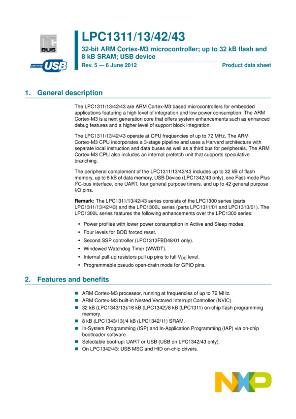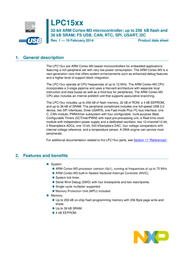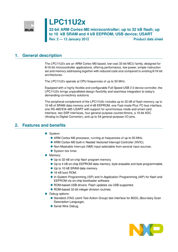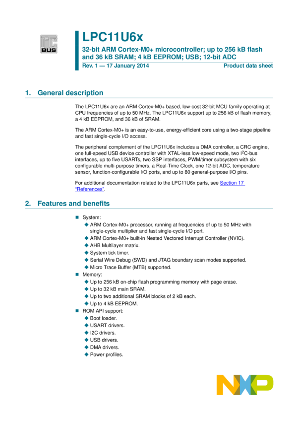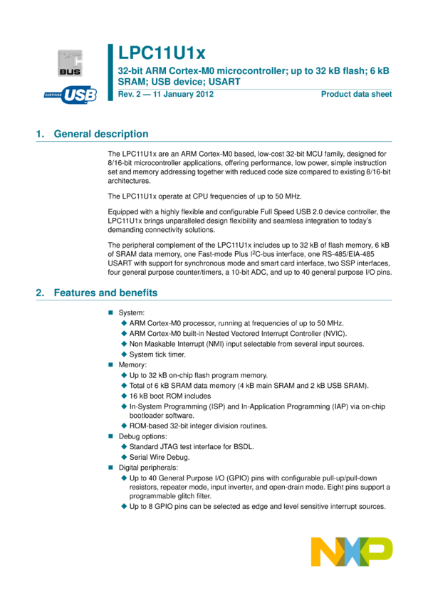 32-bit ARM Cortex-M0 microcontroller; up to 128 kB flash; up to 12 kB SRAM and 4 kB EEPROM; USB device; USART