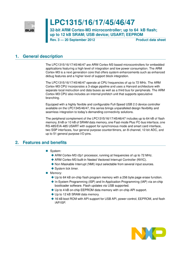 32-bit ARM Cortex-M3 microcontroller; up to 64 kB flash; up to 12 kB SRAM; USB device; USART; EEPROM