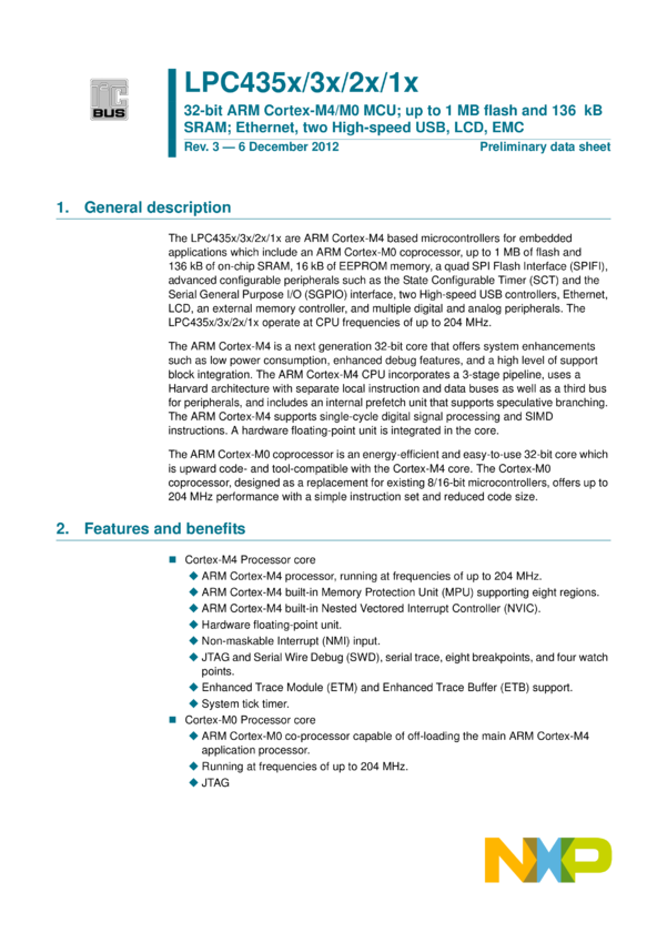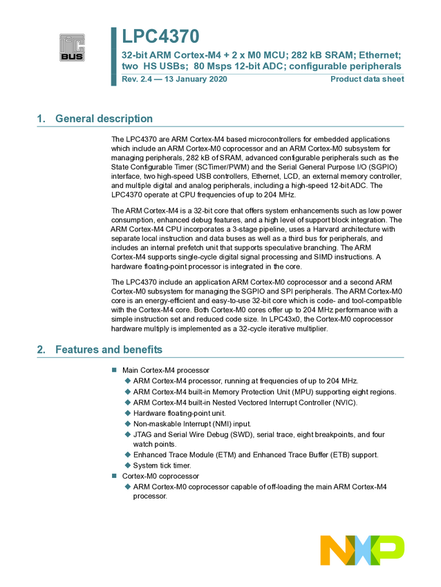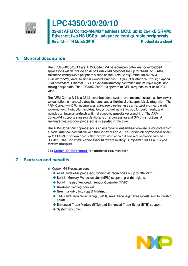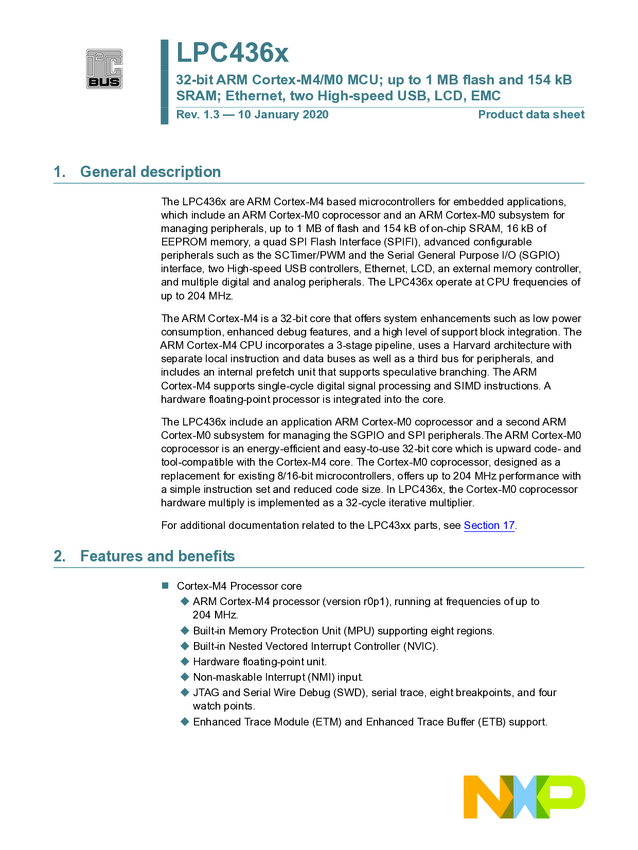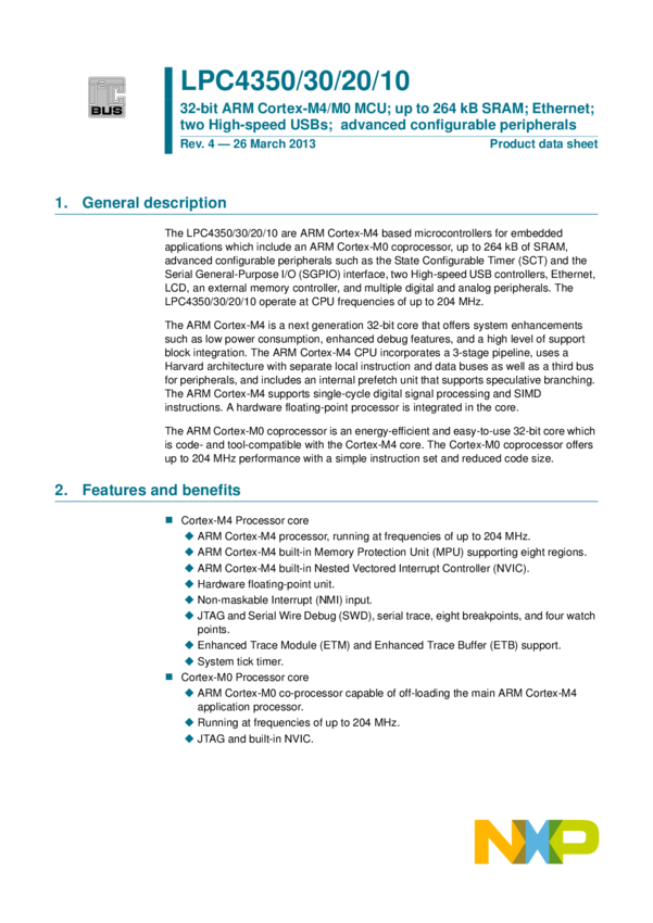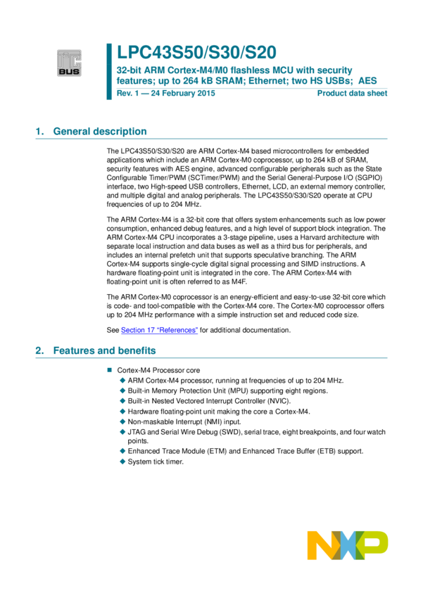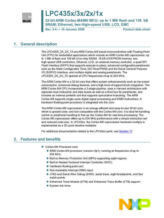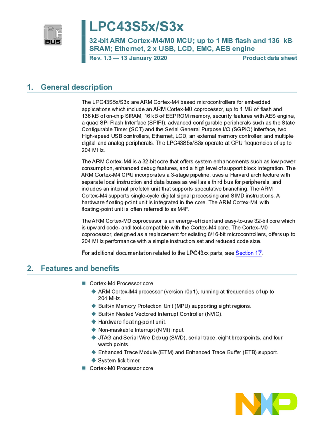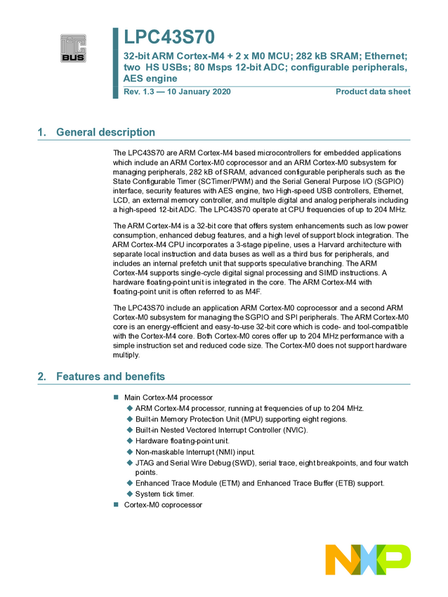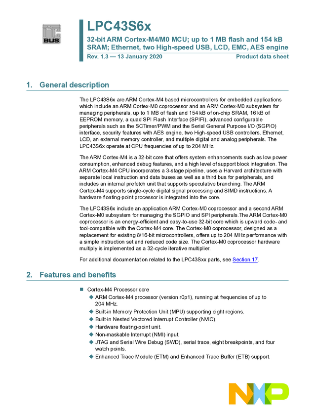 32-bit ARM Cortex-M4/M0 MCU; up to 1 MB flash and 136 kB SRAM; Ethernet, 2 x USB, LCD, EMC, AES engine