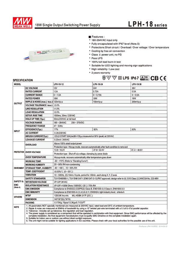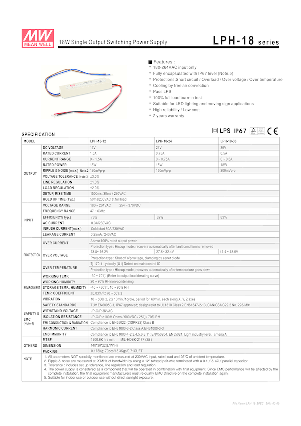 Zasilacz stałonapięciowy MEAN WELL LPH-18-12, , Iwyj max = 1.5A, IP67, ROHS