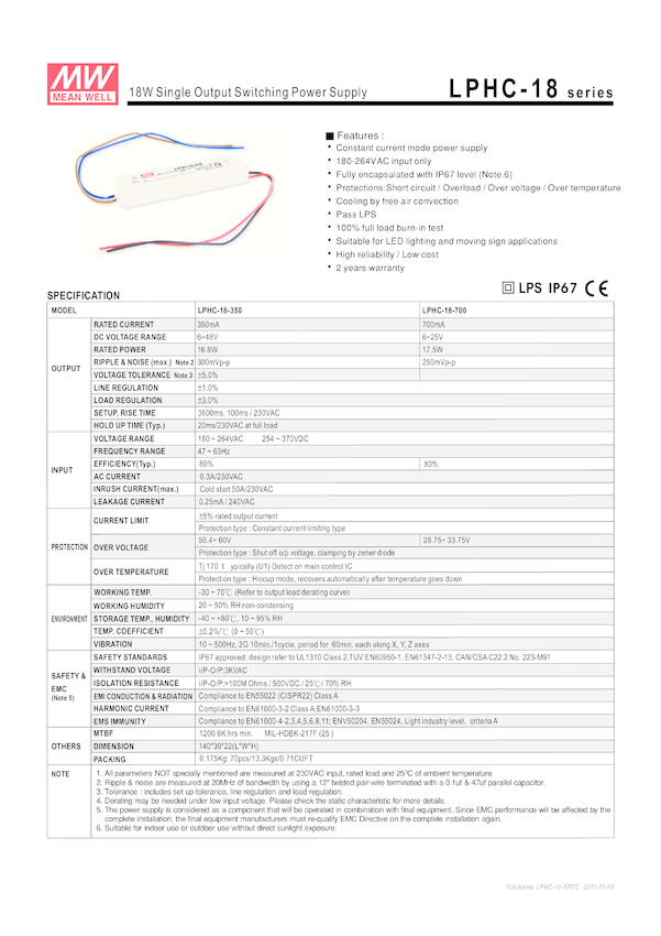 Zasilacz stałoprądowy MEAN WELL LPHC-18-350, Uwyj = 6-48V DC, IP67, ROHS