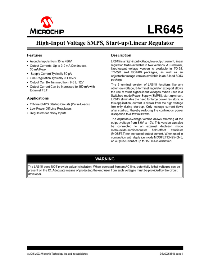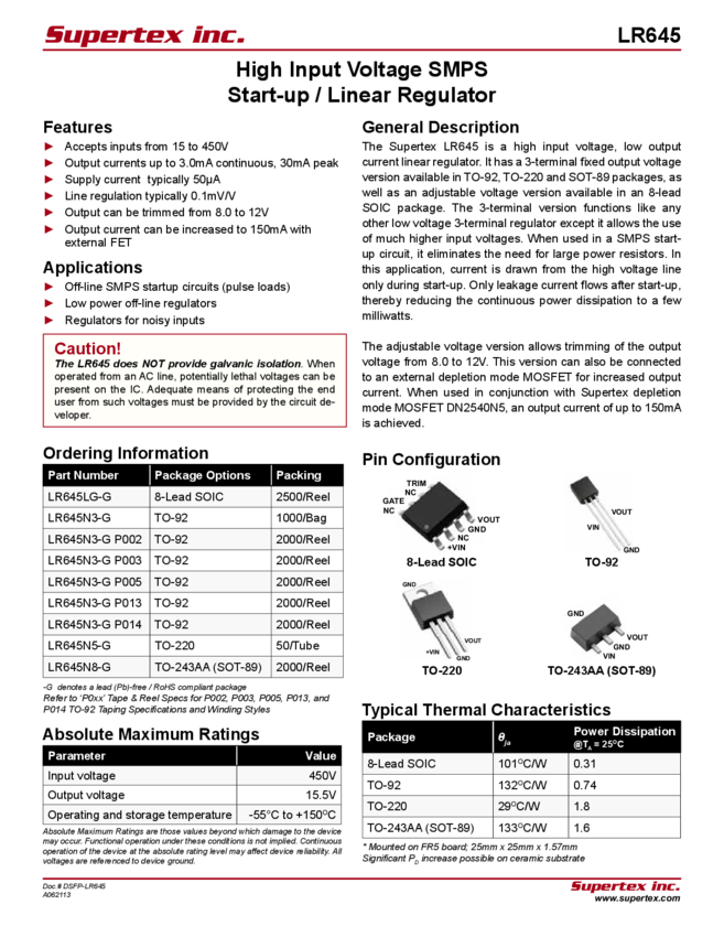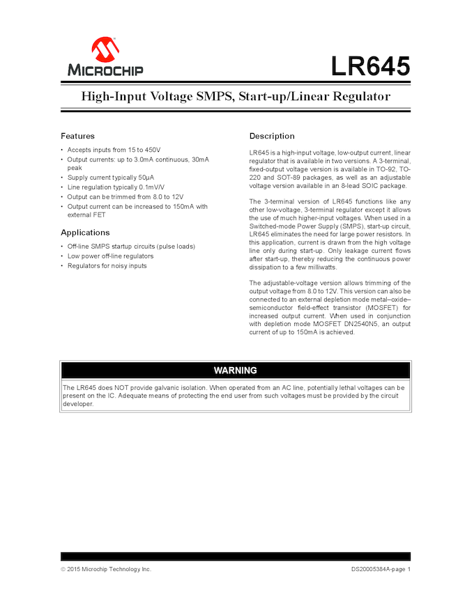 LR645 Datasheet - High Input Voltage SMPS Start-up / Linear Regulator (04/09/2015)