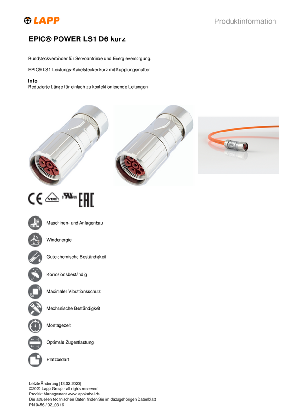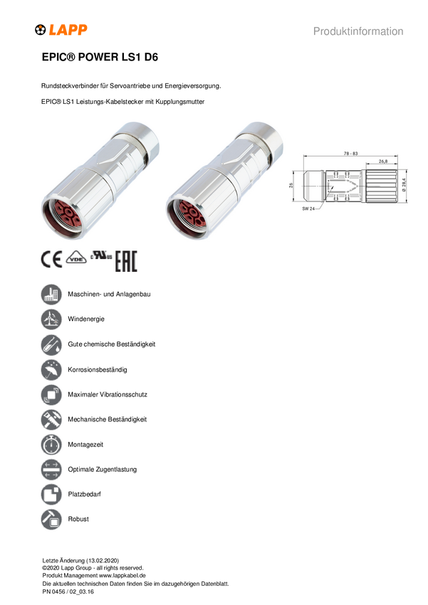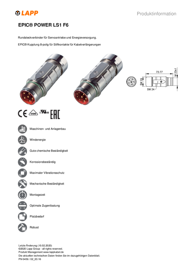 Styk złącza kablowego 76134510 EPIC® POWER LS1 F6 3+PE+4 7,5-15,5 LAPP Zawartość: 20 szt.