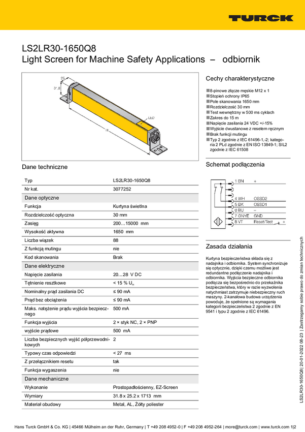 Turck Kurtyna świetlna LS2LR30-1650Q8 Wysokość ochronna 1650 mm
