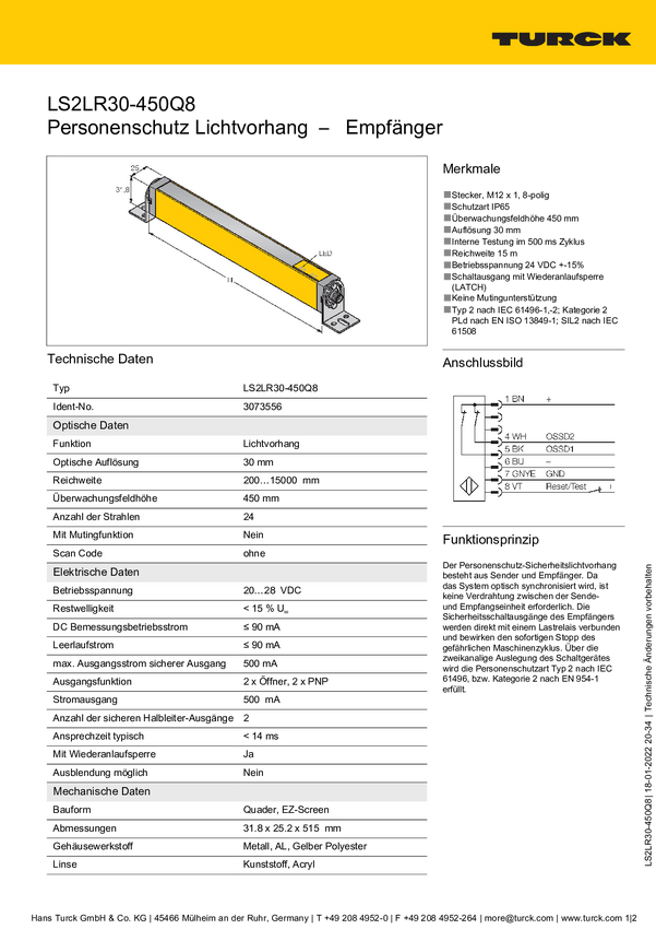Turck Kurtyna świetlna LS2LR30-450Q8 Wysokość ochronna 450 mm