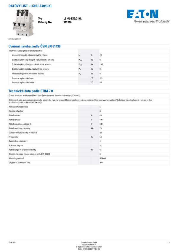 Eaton 119716 LSHU-E40/3-KL Wyłącznik główny bezpieczeństwa 40 A 230 V, 400 V