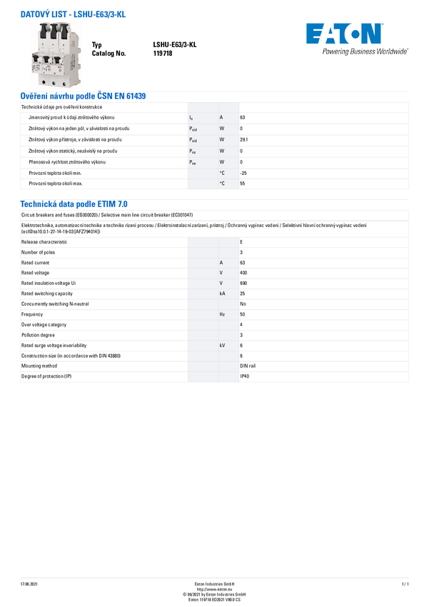 Eaton 119718 LSHU-E63/3-KL Wyłącznik główny bezpieczeństwa 63 A 230 V, 400 V