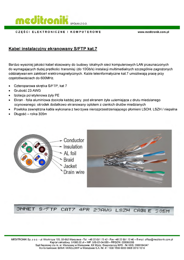 Kable f/ftp kat.6a lsoh 4x2x23awg dca 500m (10gb/s) 25 lat gwarancji, badanie ja