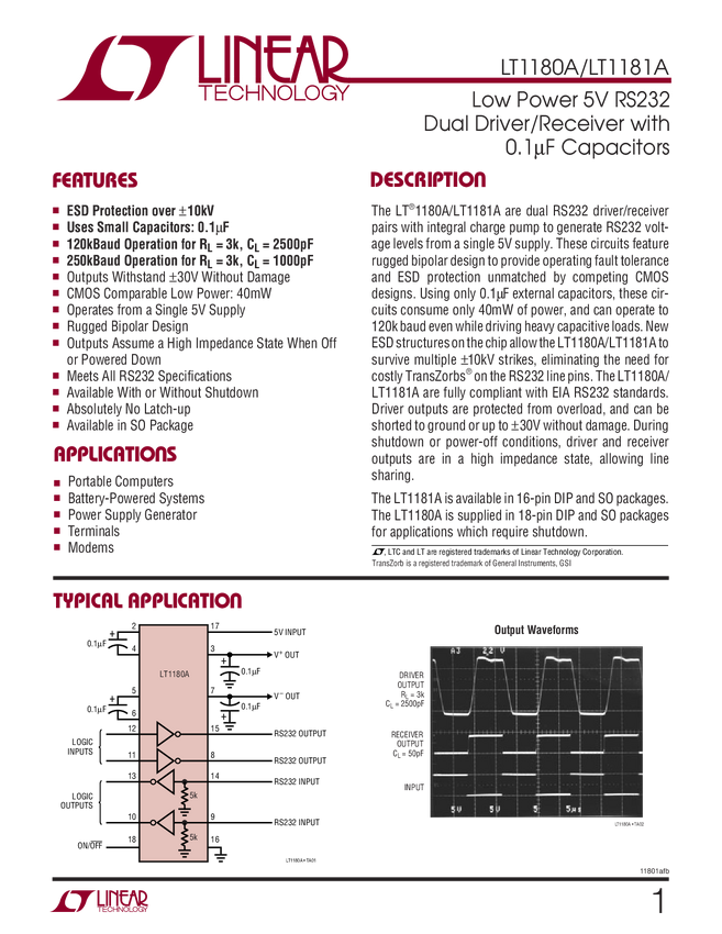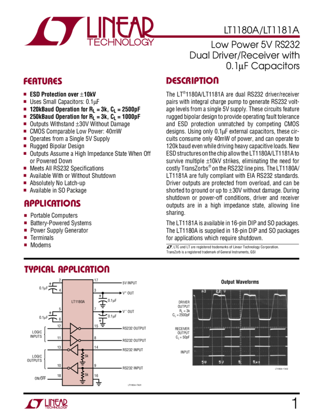 Low Power 5V RS232 Dual Driver/Receiver with 0.1µF Capacitors