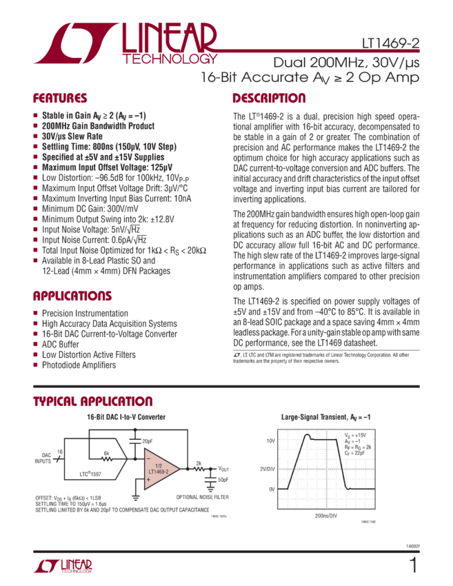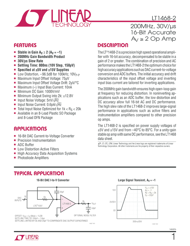 200MHz, 30V/μs 16-Bit Accurate AV ≥ 2 Op Amp