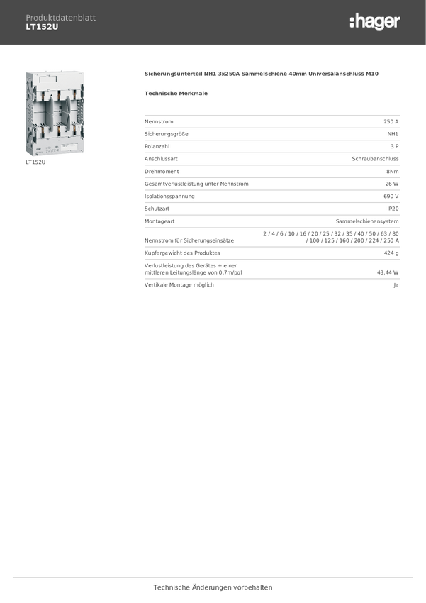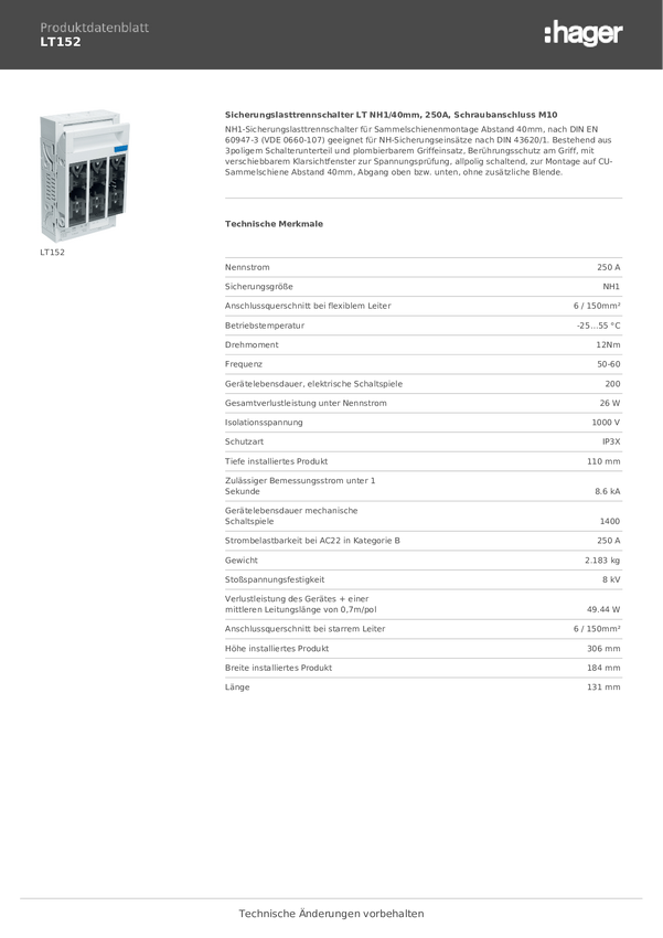 Hager LT152 Rozłącznik bezpiecznikowy Rozmiar bezpiecznika = 1 250 A 1 szt.