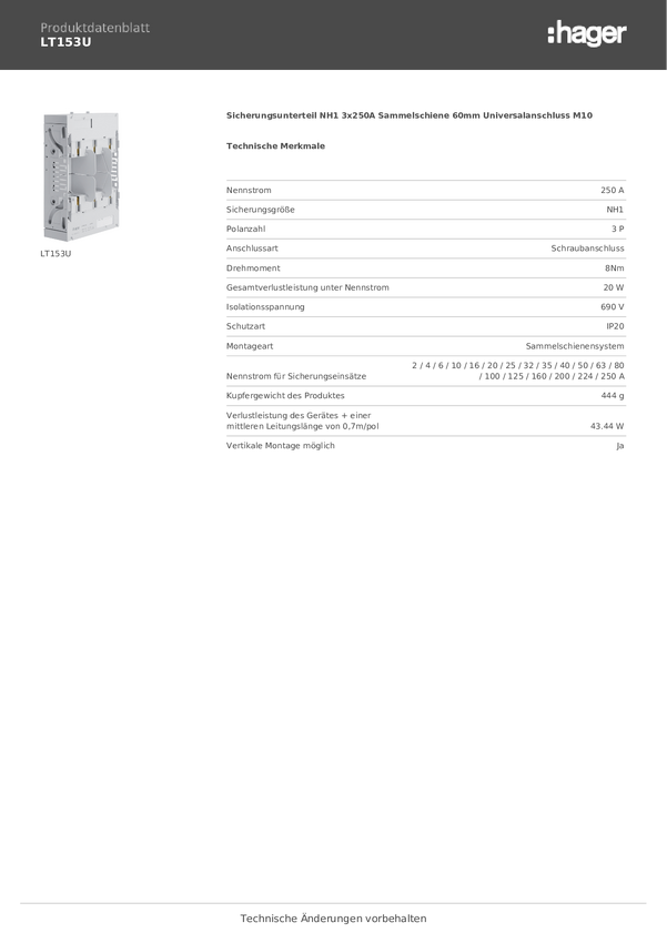 Hager LT153 Rozłącznik bezpiecznikowy Rozmiar bezpiecznika = 1 250 A 1 szt.