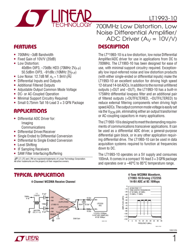 700MHz Low Distortion, Low Noise Differential Amplifier/ADC Driver (AV = 10V/V)