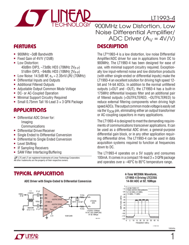 900MHz Low Distortion, Low Noise Differential Amplifier/ADC Driver (A = 4V/V)