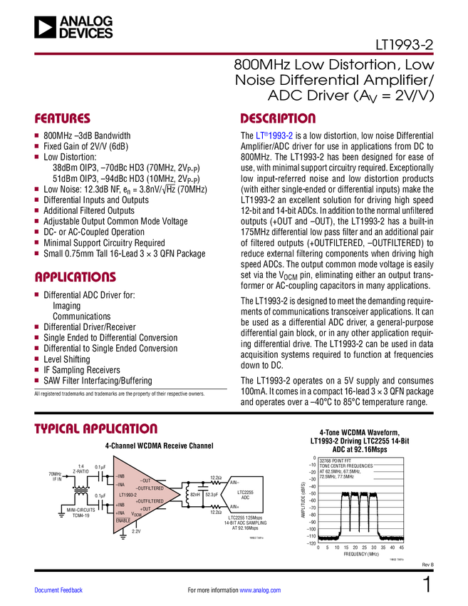 800MHz Low Distortion, Low Noise Differential Amplifier ADC Driver (Av = 2V/V)