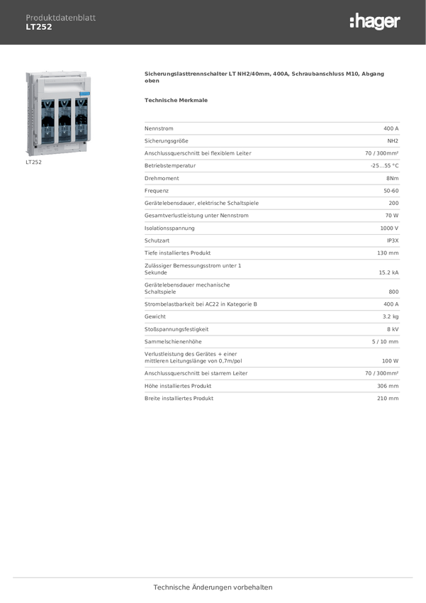 Hager LT252 Rozłącznik bezpiecznikowy Rozmiar bezpiecznika = 2 400 A 1 szt.
