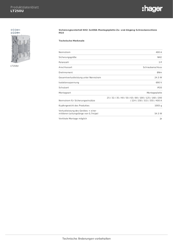 Hager LT250U Podstawa bezpiecznikowa Rozmiar bezpiecznika = 2 400 A 1 szt.