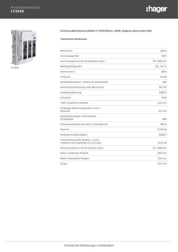 Hager LT254E Rozłącznik bezpiecznikowy Rozmiar bezpiecznika = 2 400 A 1 szt.